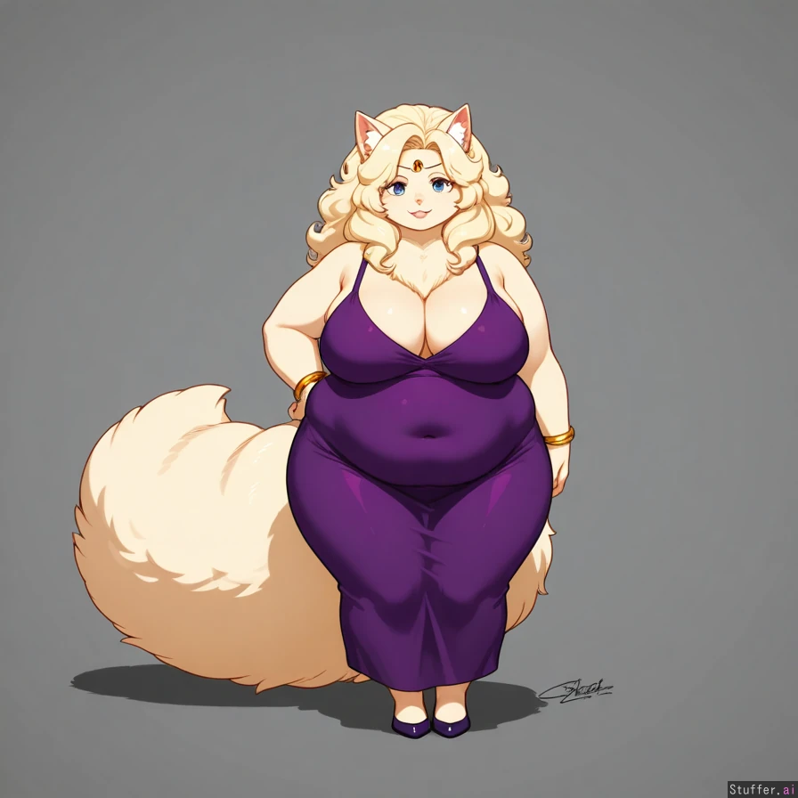 high quality, chubby, sexy, mature, anthropomorphic cat lady, silvery cream fur, tight dark purple dress, jewelry, blonde fluffy hair