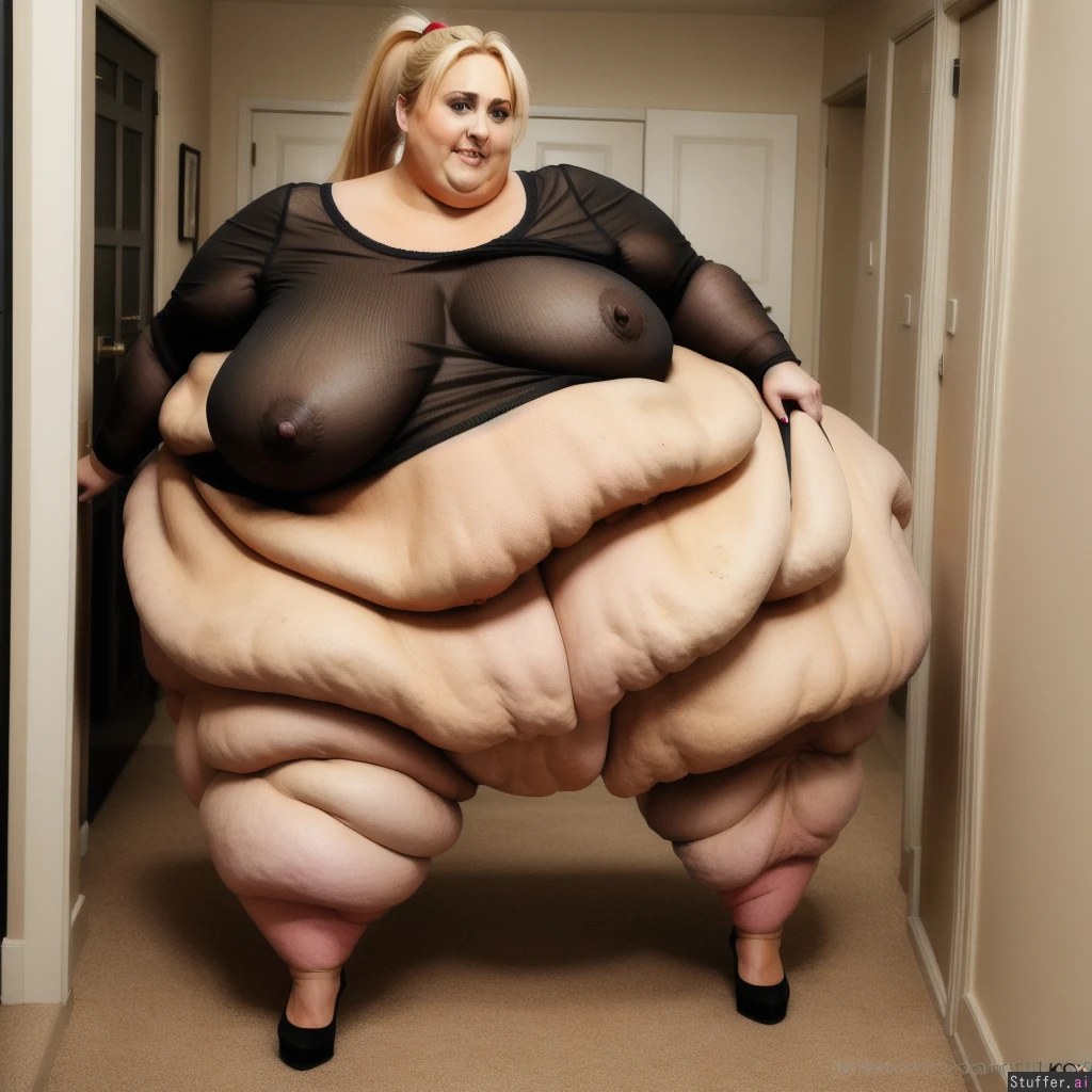 *rebel wilson) (dark tanned skin:1.4) (ponytail) hallway ((mega-fat legs:1.5)) (gigantic breasts:1.5) happy nipples (see-thru knit top) ((8K Ultra-high definition:1.4)) (deep navel:1.3)