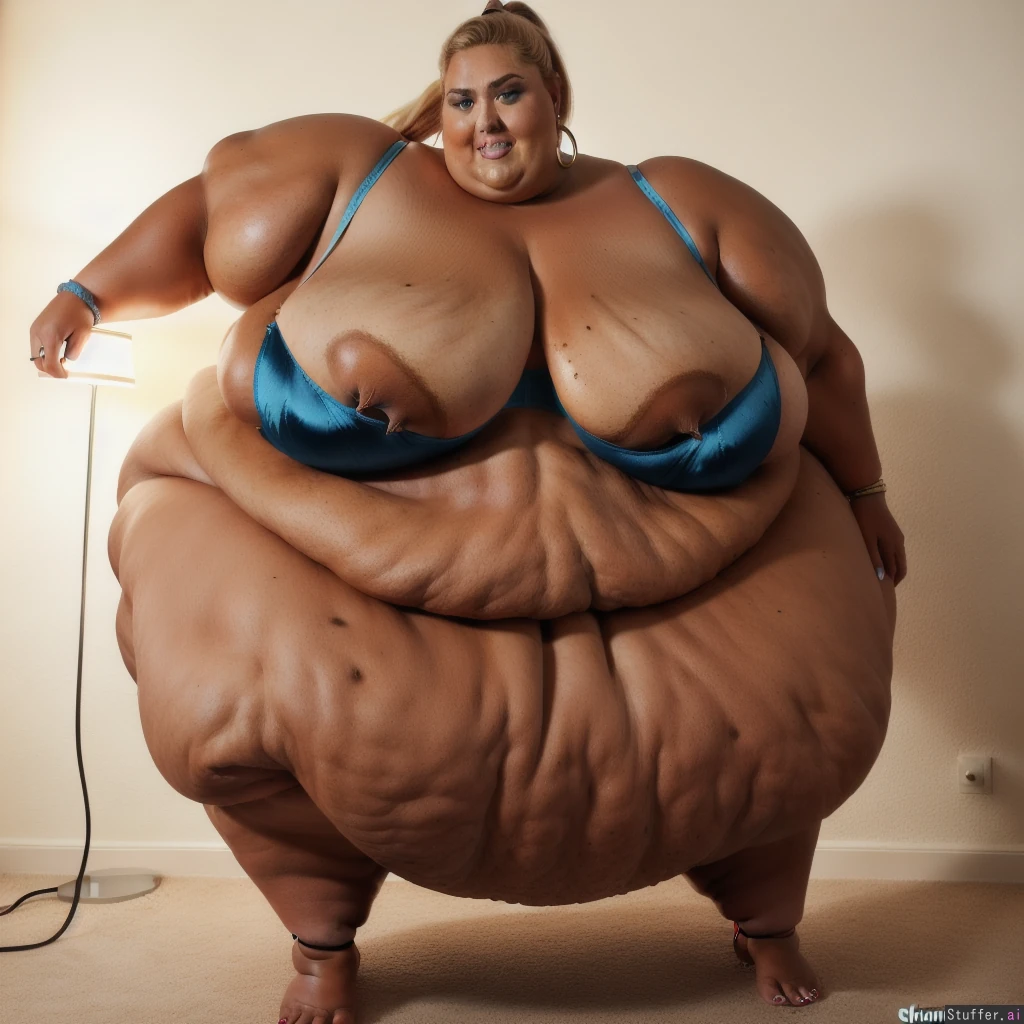 (ssbbw, rebel wilson) (dark tanned skin:1.4) (ponytail) happy (red shorts, bra) ((8K Ultra-high definition:1.4)) (deep navel:1.3) lamp sofa, (full body) (jewelry, bracelets, ankle bracelets, hoops) (blue eyes;1.3) (muscles:1.4) (fat arms:1.5) (((humongous breasts:2.0)))