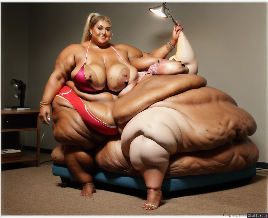 (ssbbw, rebel wilson) (dark tanned skin:1.4) (ponytail) happy (red shorts, bra) ((8K Ultra-high definition:1.4)) (deep navel:1.3) lamp sofa, (full body) (jewelry, bracelets, ankle bracelets, hoops) (blue eyes;1.3) (muscles:1.7) (fat arms:1.5) (((humongous breasts:2.0)))