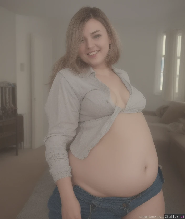 ((photorealistic 4.5)), (realistic face), super sexy, fine detail, realistic shading, atmospheric, grabbing own ass, Cleavage, show ultra soft belly, (1girl), plump, braided ponytail, dark blonde, oval face, ((small breasts)), (fat lower body), deep neckline, (unbuttoned high waisted jeans open belly, thick thighs), short top with long sleeves, detailed face, (chunky legs), (chubby arms), love handles, big ass, thick bulging hips, thick thighs, smiles sheepishly, round belly bulge