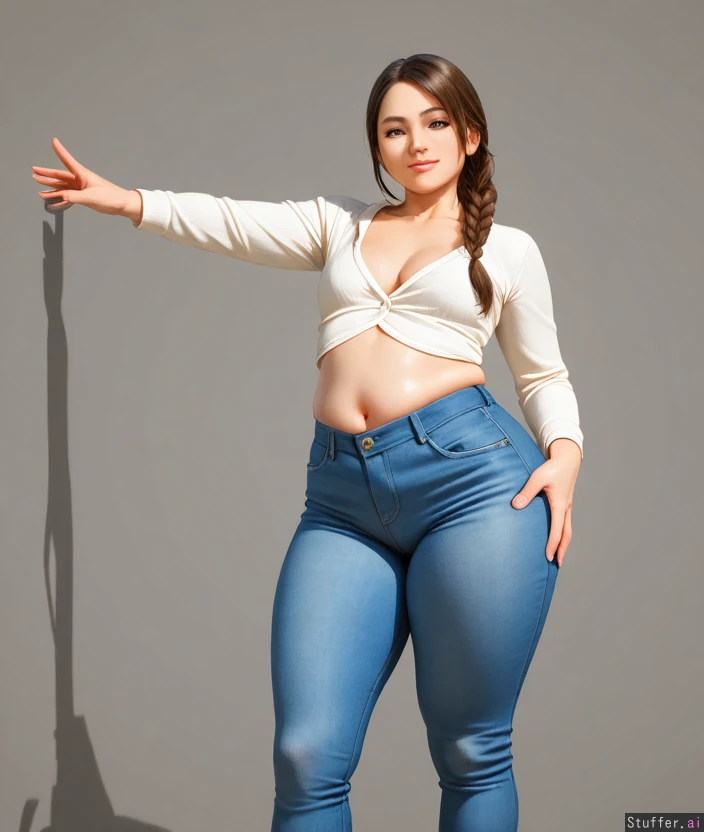 ((photorealistic 4.5)), (beautiful face), super sexy, fine detail, realistic shading, atmospheric, grabbing own ass, Cleavage, show ultra soft belly, (1girl), plump, braided ponytail, dark blonde, oval face, ((small breasts)), (fat lower body), deep neckline, (unbuttoned high waisted jeans open belly, thick thighs), short top with long sleeves, detailed face, (chunky legs), (chubby arms), love handles, big ass, thick bulging hips, thick thighs, smiles sheepishly, round belly bulge