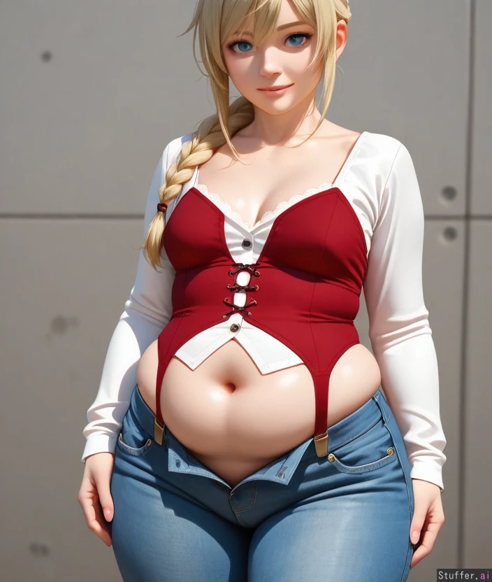 ((photorealistic 4.5)), (Keira Knightley), super sexy, fine detail, realistic shading, atmospheric, grabbing own ass, Cleavage, show ultra soft belly, (1girl), plump, braided ponytail, dark blonde, oval face, ((small breasts)), (fat lower body), deep neckline, (unbuttoned high waisted jeans open belly, thick thighs), short top with long sleeves, (chunky legs), (chubby arms), love handles, big ass, thick bulging hips, thick thighs, smiles sheepishly, round belly bulge