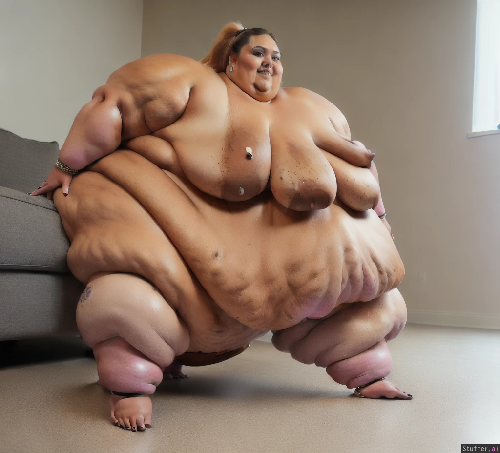 (ssbbw:1.4) (rebel wilson) (dark tanned skin:1.4) (ponytail) happy ((8K Ultra-high definition:1.4)) (deep navel:1.3) lamp sofa, (full body) (jewelry, bracelets, ankle bracelets, hoops) (blue eyes;1.3) (bellies:1.5) (fat arms:1.9) (((humongous breasts:1.9))) ((sagging belly down to the floor:1.9)) (alone, 1girl) ((side view:1.3)) (hands on belly:1.3)