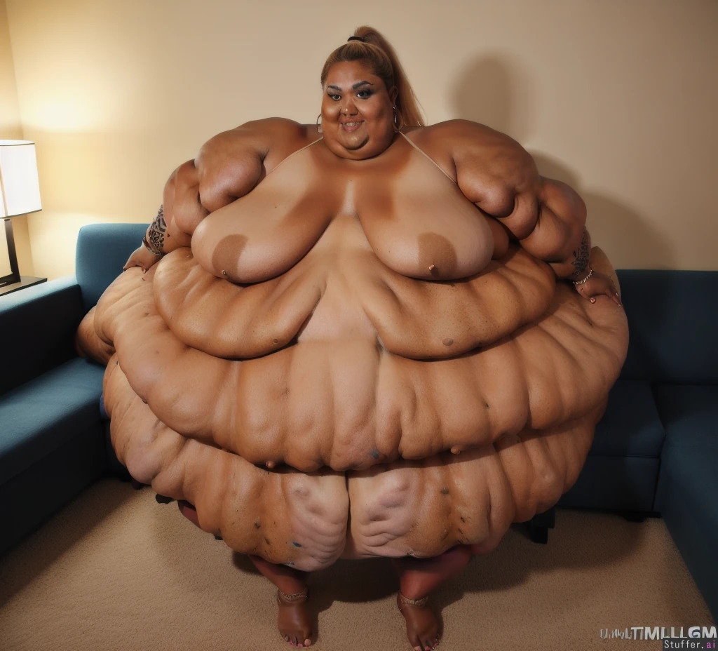 (rebel wilson) (dark tanned skin:1.4) (ponytail) happy ((8K Ultra-high definition:1.4)) (deep navel:1.3) lamp sofa, (full body) (jewelry, bracelets, ankle bracelets, hoops) (blue eyes;1.3) (multiple fat bellies:1.5) (fat arms:1.9) (((humongous breasts:1.5))) (hands on belly:1.3)