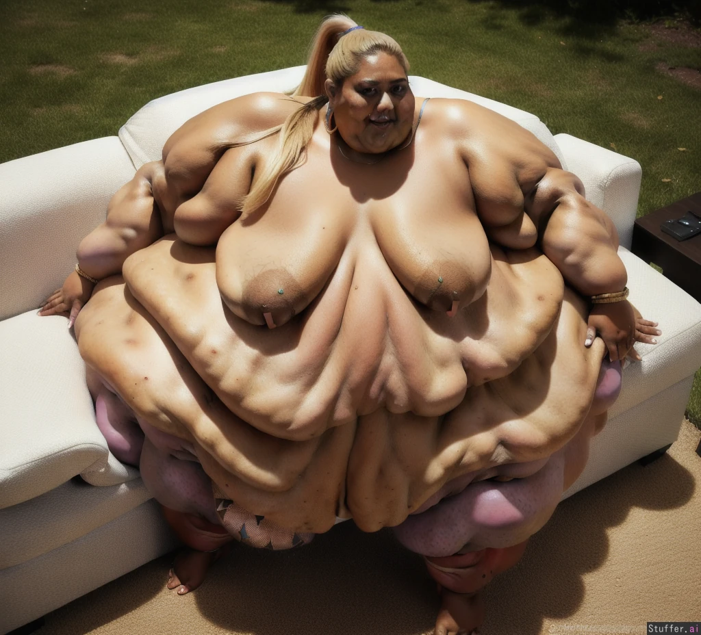 (rebel wilson kissing samus) (dark tanned skin:1.4) (ponytail) happy ((8K Ultra-high definition:1.4)) (deep navel:1.3) lamp sofa, (full body) (jewelry, bracelets, ankle bracelets, hoops) (blue eyes;1.3) (multiple sagging breasts:1.5) (fat arms:1.5) (hands on belly:1.0) side view (((morbidly obese:1.9)))