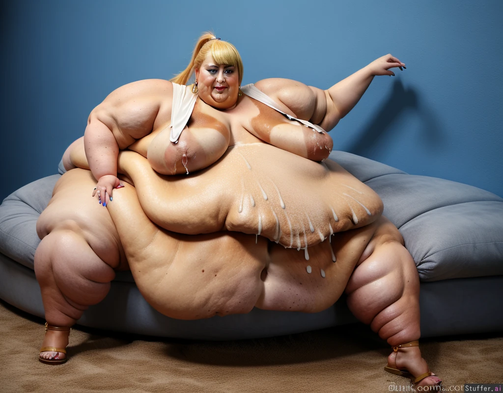 ssbbw (18K Ultra-HD) (rebel wilson:1.3) ponytail earrings (high definition) blonde, ssbbw, (dark tanned skin:1.5), (full body:1.2) ((puffy squishy:1.2)) (rebel wilson kissing samus) ((massive slumping belly:1.9)) nipples, (sagging under-belly;1.9) (blue eyes) teeth ((blue eyes, makeup)) 1girl (side view) (double chin:1.6) ((super-immobile:1.3)) ((blue eyes;1.5)) (giant lactating breasts:1.6)) ankles feet sandals