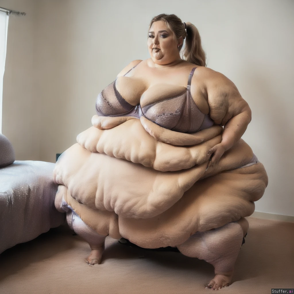 ((((1 person:1.3)))) blonde ((paris hilton) ((((4k ultra hd high detail,photorealistic,masterpiece:1.56)))) ((highly detailed clothing:1.1)) ((((the heaviest and fattest and widest and most incredibly huge breasted realistic sexy detailed hyperimmobile scantily dressed hourglass ussbbw with super gigantic breasts ever conceived by AI,ussbbw shoulders above breasts,ussbbw separate huge fat legs,immobile ussbbw detailed seductive face clearly visible:1.31)))) (((long wavy hair in a pony tail:1.5)))) ((((Realistic hyperimmobile beautiful ussbbw brunette resting in her soft bed, face never gets fat, closed mouth, normal hands, holding her fat, looking proud and seductive:1.3)))) (((correct anatomy))) ((((highly detailed realistic face:1.5)))) (((indoor bedroom, drapes, nightstand, open windows,daytime, soft natural light, realistic lighting, extremely large room:1.15))) ((((hyper curvy hourglass immobile body with visibly massive impossibly gigantic butt and hips and impossibly massive breasts, relatively small belly for her size, vastly gargantuan breasts symmetrical in size and shape:1.6)))) ((((extremely wide and deep hyperimmobile ussbbw with a relatively tiny head, hyperimmobile ussbbw composed mostly of breast fat:1.5)))) ((Very large indoor bedroom, luxury bed, silk sheets, open windows, vanity, side table, daylight:1.3)) (((extreme_massively_obese, cellulite, highly detailed realistic fat skin))) ((((fattest of all in her super wide butt/hips with deep long butt crack,large_solid_ultrawide_gigantic_sexy_butt,hips and thigh fat connected,enormous breasts of equal size, , freakishly enormous breasts larger than her gigantic fat hips, breasts clothed, massive breast shelf, extremely deep and long cleavage,extreme hourglass ussbbw realistically weighs over 8 tons, weight increases hip volume, weight increases hips volume, weight increases breast volume, impossibly hyperinflated gigantic world record size fat breasts, one_immobile_ussbbw_fat_growing_symmetrically, one_highly_symmetric_immobile_fat_body, immobile ussbbw with all her fat in the breasts and hips, each breast weighs several tons, fat increases breast size, head is not fat, face not fat, neck is not fat, forearms and hands are normal size, feet are normal size, shoulders are not fat, torso only gets fatter in breasts, enormous custom bra is slightly too small, hyperinflated breasts over 4 feet wide, breasts stretching bra to the limit, severe lipedema hips over 20 feet wide, room much wider than her hips, enormous fat hips and butt flowing out from her waist to her sides and rear, immobile ussbbw ass and breasts covering the large room floor, vast breast shelf and cleavage flowing more than 7 feet in front of her held by one enormous bra, fat thighs and hips overflowing the bed,breasts and ass fatter than everything else,fat_accumulates_evenly_only_in_lower_body_and_breasts,torso_and_belly_and_hands_neverget_fat,butt crack, extremely wide solid sexy butt,flat shelf of hips and hip fat over 80 feet wide and 4 feet deep,fat breasts barely contained an massively gigantic custom bra, panties around her entire hips , stretched sexy lingerie:1.61)))) (((large_symmetric_fat_body_partsdeep_fat_folds,fat_sagging,legs_pushed_apart_by_fat))) (((entire immobile fat lady visible, feet buried in fat:1.5))) ((fat grows horizontally, fat affected by gravity,extremely wide and deep immobile ussbbw:1.15)) ((other objects in the room, full width view of her impossibly wide immobile fat hips,angle and shadows reveal ussbbw massive size in all 3 dimensions:1.42)) ((((whole head is clearly visible,breasts in mega gigantic formed bra))))