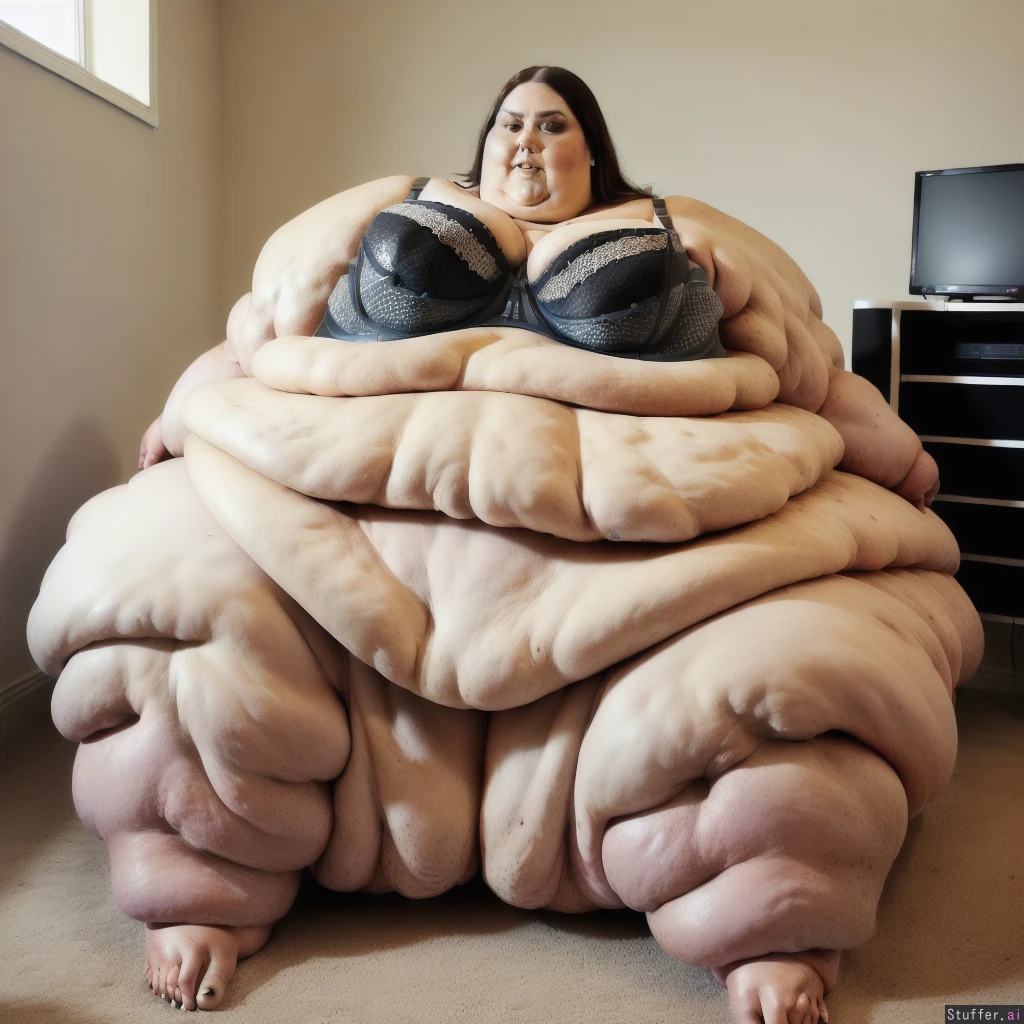 (((large_symmetric_fat_body_partsdeep_fat_folds,fat_sagging,legs_pushed_apart_by_fat))) (((entire immobile fat lady visible, feet buried in fat:1.5))) ((fat grows horizontally, fat affected by gravity, extremely wide and deep immobile ussbbw:1.15)) ((other objects in the room, full width view of her impossibly wide immobile fat hips,angle and shadows reveal ussbbw massive size in all 3 dimensions:1.42)) ((((whole head is clearly visible, breasts in mega gigantic formed bra))))