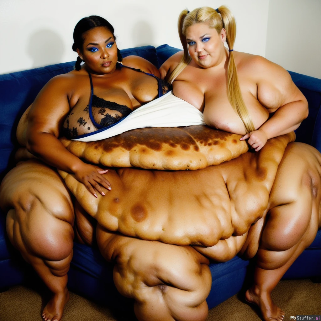 ssbbw (mega-blob:1.5), sitting on a stool ((fat legs:1.5)) blonde, pigtails (dark tanned skin:1.5) happy (blue eyes:1.3) ((mega-large breasts:1.5))
