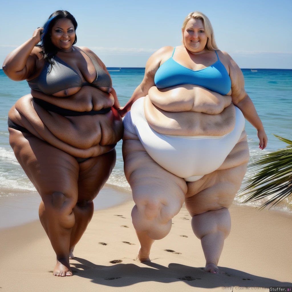 ssbbw ((fat legs:1.5)) ((bottom heavy:1.5)) ((thin waist:1.4)) ((big tits:1.4)) blonde (dark tanned skin:1.4) happy (blue eyes:1.3) walking along the beach. ((smiling at the camera)) ((blue eyes:1.5))