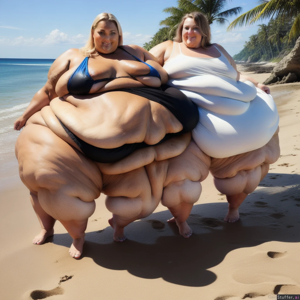 ssbbw ((fat legs:1.6)) ((bottom heavy:1.6)) ((thin waist:1.6)) ((big tits:1.4)) blonde (dark tanned skin:1.4) happy (blue eyes:1.3)beach palms. ((smiling at the camera)) ((blue eyes:1.5))