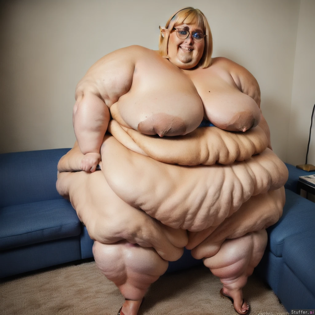 ssbbw ((fat legs:1.6)) ((bottom heavy:1.6)) tall giantess ((fat hips:1.6)) ((fat thighs:1.6)) ((big tits:1.8)) ((fat arms:1.5)) blonde (dark tanned skin:1.5) happy (blue eyes:1.3) Livingroom lamp. ((smiling at the camera)) ((blue eyes:1.5)) (rebel wilson) ((UHD, 8K ultra-HD)) ((highly detailed face:1.4)) naked (((long tubular breasts:1.5))) flip flops glasses elf cleavage ((fat face:1.5)) ((short hair)) (((extremely fat arms;1.6)))