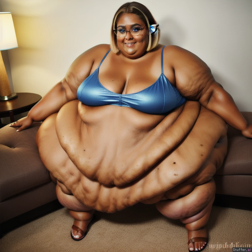 ssbbw tall blonde (dark tanned skin:1.5) happy (blue eyes:1.3) Livingroom lamp. ((smiling at the camera)) (rebel wilson) ((UHD, 8K ultra-HD)) ((highly detailed face:1.4)) flip flops glasses elf cleavage ((fat face:1.5)) ((short hair)) (((extremely fat arms;1.9)))