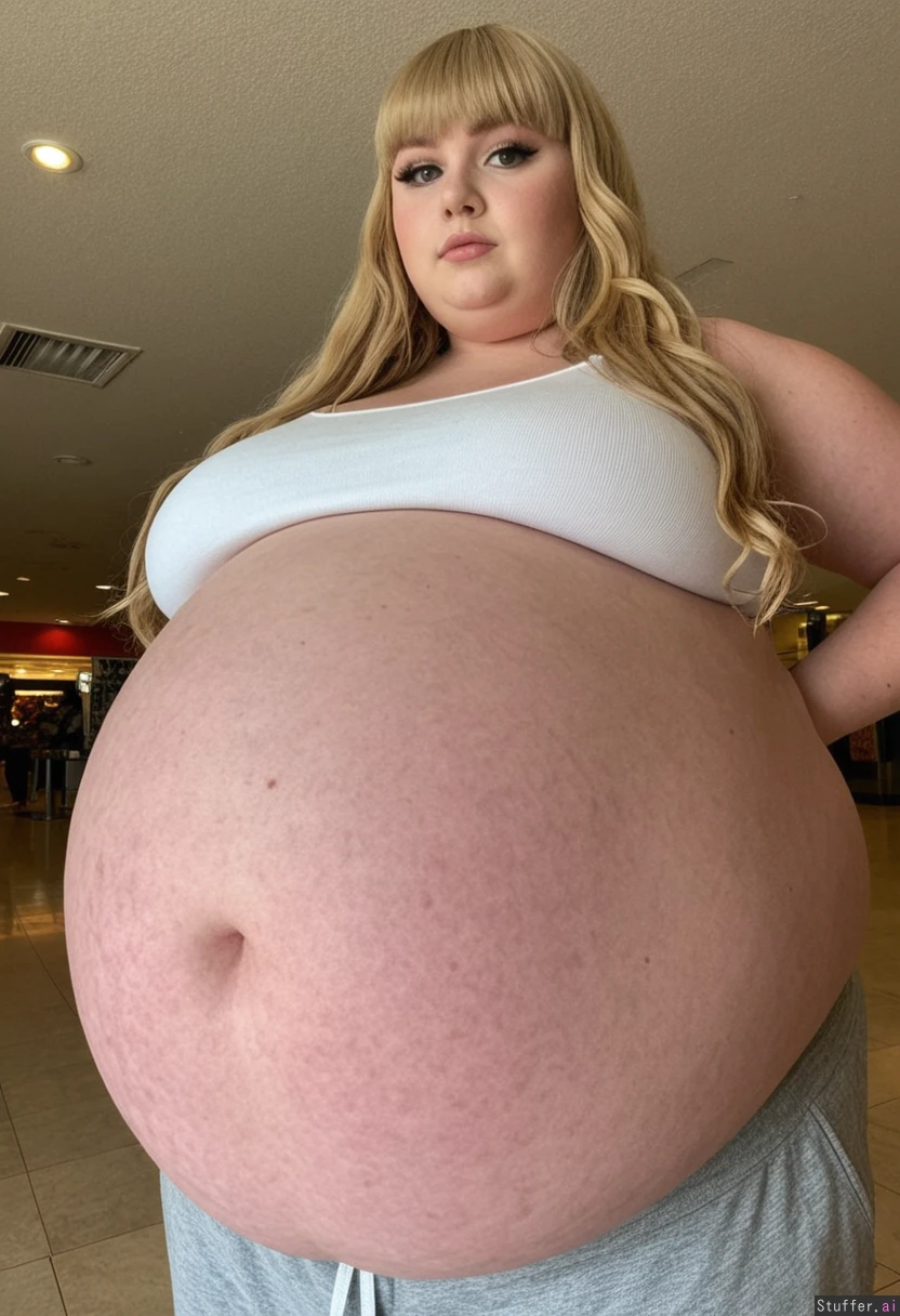20 year old, American girl. Super model fave. Makeup, eyelashes, eye shadow, (long wavy hair, bangs, blonde highlights) Wearing grey sweatpants and a white tank top, standing at a mall Ssbbw, thick thighs, belly hang, (gigantic belly:1.8) pale skin. Big breast Very big ssbbw), (gigantic round sagging belly), (((massive widest giant hips, giant thick thights)))