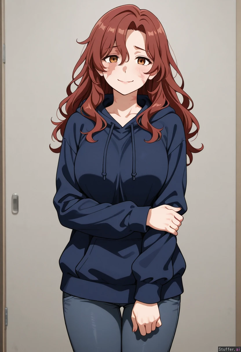 Mature Woman with wavy auburn hair, brown eyes, and a nervous smile. She has burn scars covering her eye and body. She wears a dark blue baggy hoodie and long pants. She is nervously clutching her arm.