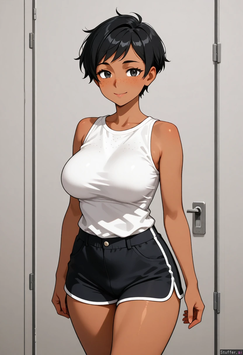 Mature Woman with black pixie cut, dark eyes, dark skin, and freckles. She has a confident smile on her face. She wears a white sleeveless shirt and shorts.