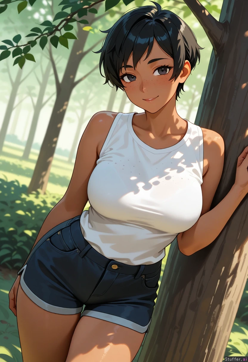 Mature Woman with black pixie cut, dark eyes, dark skin, and freckles. She has a confident smile on her face. She wears a white sleeveless shirt and shorts leaning against a tree
