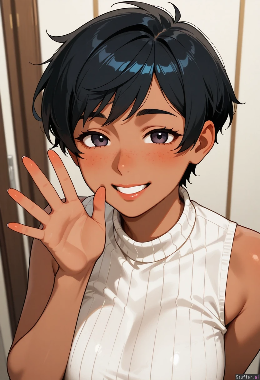 Mature Woman with black pixie cut, dark eyes, dark skin, and freckles. She has a wide smile on her face. She wears a white sleeveless shirt and waving.