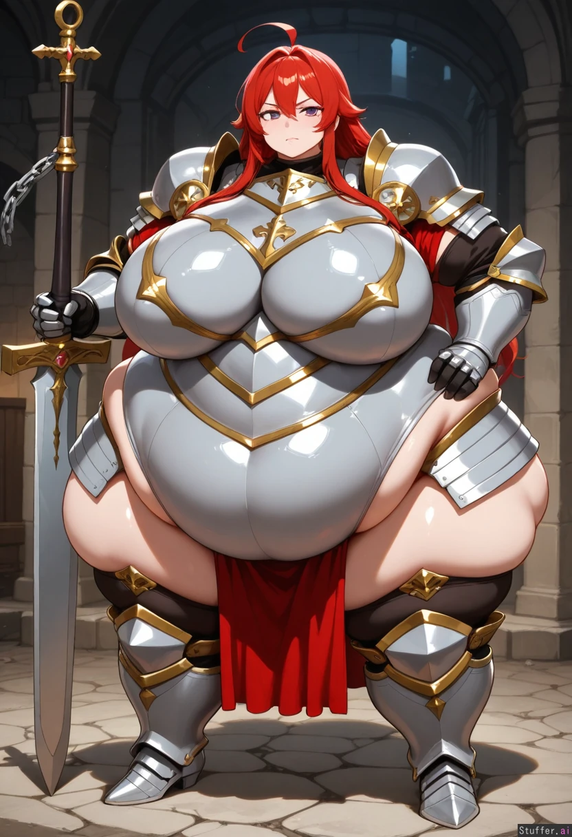 Morbidly obese, hyper fat female knight with flowing red hair.