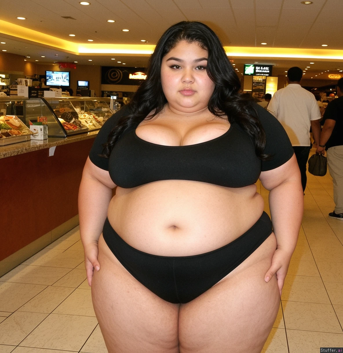 Half Jamaican half Mexican girl, pretty, soft_features, small nose, natural_eyebrows, soft_jawline, attractive, in_her_prime, 23 y/o, long_dark black_straight wavy, (((fully_dressed))) wearing low cut black leggings and small cropped nice shirt with tight sleeves.. Shes fat and her belly is hanging in a large outlet mall, walking away from food court. 24K RAW DSLR ultra detail, best-quality, highest-quality, good-lighting, (fat_belly), (((fatty face))) (Flabby arms) (Very Thick thighs:1.4) (Big Deep belly button) Junk food