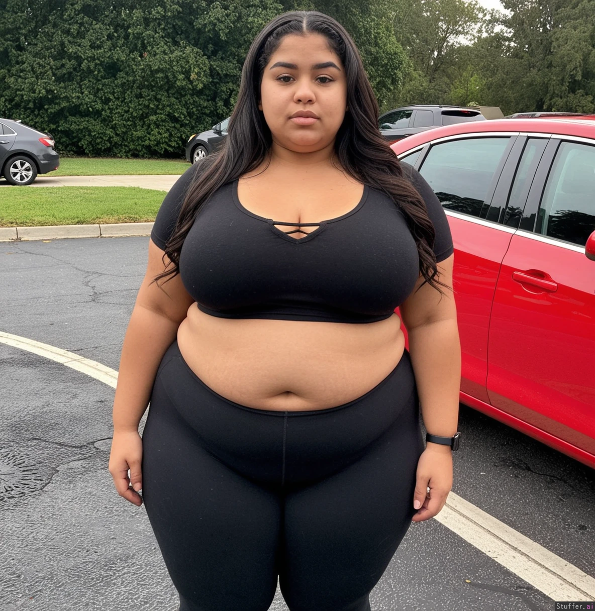 Half Jamaican half Mexican girl, pretty, soft_features, small nose, natural_eyebrows, soft_jawline, attractive, in_her_prime, 23 y/o, long_dark black_straight wavy, (((fully_dressed))) wearing low cut black tight leggings and small cropped nice shirt with tight sleeves.. Shes fat and her belly is hanging in a parking lot, waddling to the car. (fat_belly), (((fatty face))) (Flabby arms) (Very Thick thighs:1.4) (Big Deep belly button) Junk food