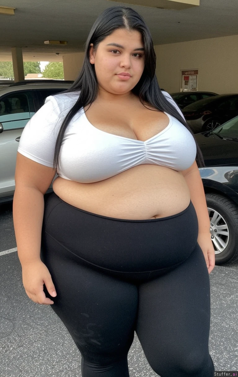 Indian, fat, soft_features, swollen face, soft_jawline, 23 y/o, long_dark black_straight hair, (((fully_dressed))) wearing low cut black tight leggings and small cropped white shirt with tight sleeves.. Shes fat and her belly is hanging in a parking lot, waddling to the car. (fat_belly), (((fatty face))) (Flabby arms) (Very Thick thighs:1.4) (Big Deep belly button) Junk food