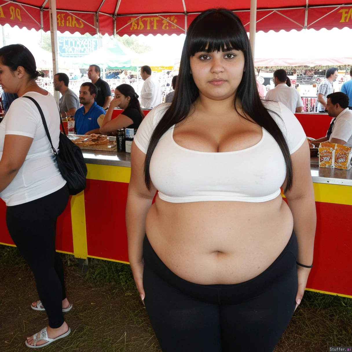 Half-Indian, half-Iranian girl, fat, dark, swollen face, soft_jawline, 23 y/o, long_dark black_straight hair with bangs) (((fully_dressed))) wearing low cut black tight leggings and small cropped white shirt with tight sleeves.. Shes fat and her belly is hanging Shes waddling through the county fair. (fat_belly), (((fatty face))) (Flabby arms) (Very Thick thighs:1.4) (Big Deep belly button) Junk food
