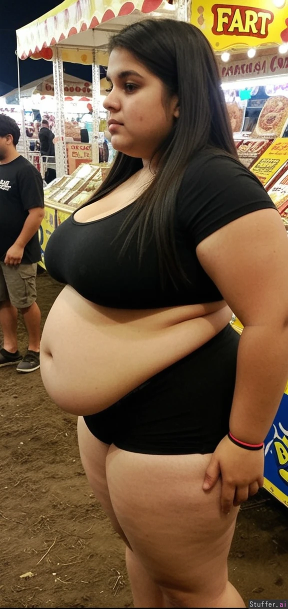 Half-Indian, half-Iranian girl, fat, dark, swollen face, soft_jawline, 23 y/o, long_dark black_straight greasy hair) (((fully_dressed))) wearing low cut black tight shorts and small band shirt with tight sleeves.. Shes fat and her belly is hanging Shes waddling through the county fair. Side profile (fat_belly), (((fatty face))) (Flabby arms) (Very Thick thighs:1.4) (Big Deep belly button) Junk food