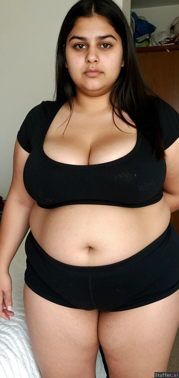 Half-Indian, half-Iranian girl, fat, dark, swollen face, soft_jawline, 23 y/o, long_dark black_straight greasy hair) (((fully_dressed))) wearing low cut black tight shorts and small band shirt with tight sleeves.. Shes fat and her belly is hanging Shes waddling through her cluttered bedroom (fat_belly), (((fatty face))) (Flabby arms) (Very Thick thighs:1.4) (Big Deep belly button) Junk food