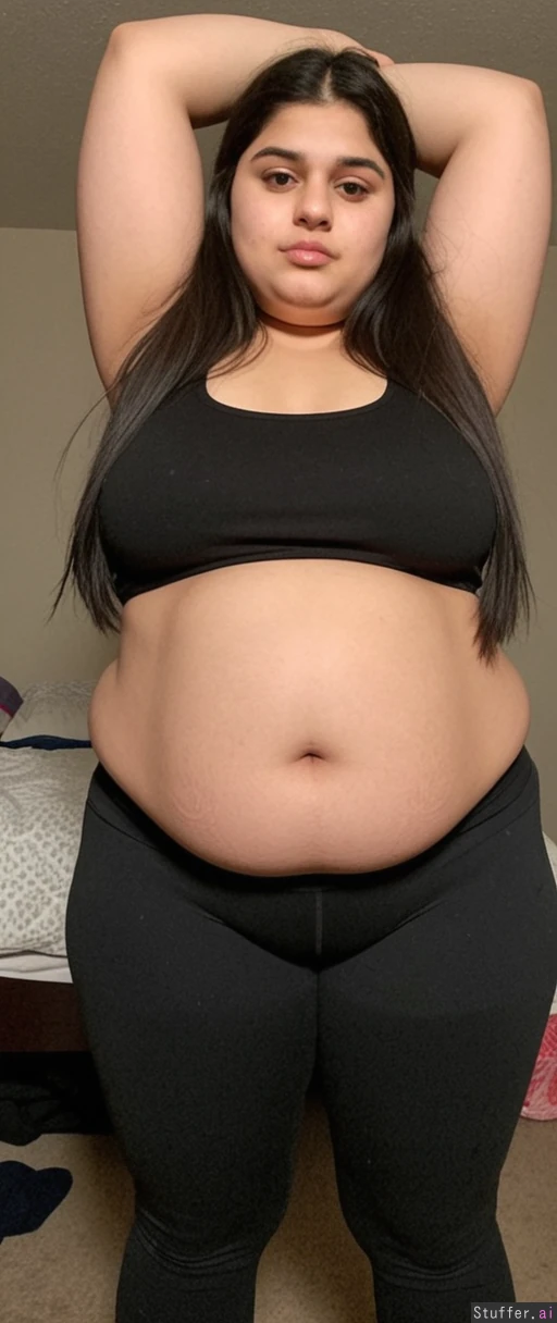 Half-Indian, half-Iranian girl, fat, dark, swollen face, soft_jawline, 23 y/o, long_dark black_straight greasy hair) (((fully_dressed))) wearing tight yoga pants and small midrise shirt with tight sleeves.. Shes fat and her belly is hanging Shes in her cluttered, messy room. (fat_belly), (((fatty face))) (Flabby arms) (Very Thick thighs:1.4) (Big Deep belly button) Junk food , gross room