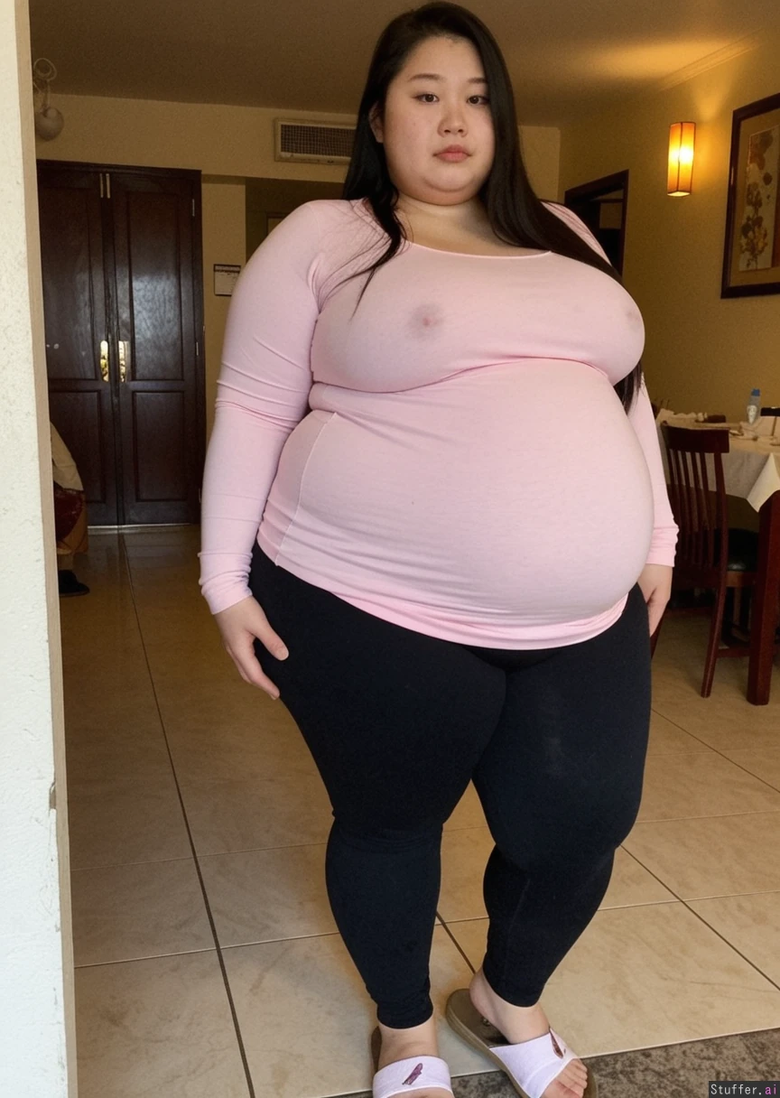 Chinese girl, morbidly fat , dark, swollen face, soft_jawline, 23 y/o, long_dark black_straight greasy hair) (((fully_dressed))) ((Fat double-chin, no neck)) wearing tight yoga pants and oversized shirt with tight sleeves.. Shes fat and her belly is hanging. Wearing slippers. Fat calves and cankles Shes waddling through her favorite Chinese restaurant. (fat_belly), (((fatty face))) (Flabby arms) Junk gross , she is sweaty