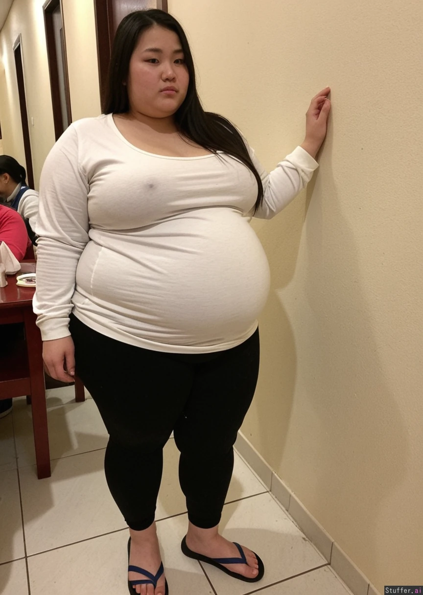 Chinese girl, morbidly fat , dark, swollen face, soft_jawline, 23 y/o, long_dark black_straight greasy hair) (((fully_dressed))) ((Fat double-chin, no neck)) ((No makeup, greasy face)) wearing tight yoga pants and oversized shirt with tight sleeves.. Shes fat and her belly is hanging. Wearing slippers. Fat calves and cankles Shes waddling through her favorite Chinese restaurant. (fat_belly), (((fatty face))) (Flabby arms) Junk gross , she is sweaty
