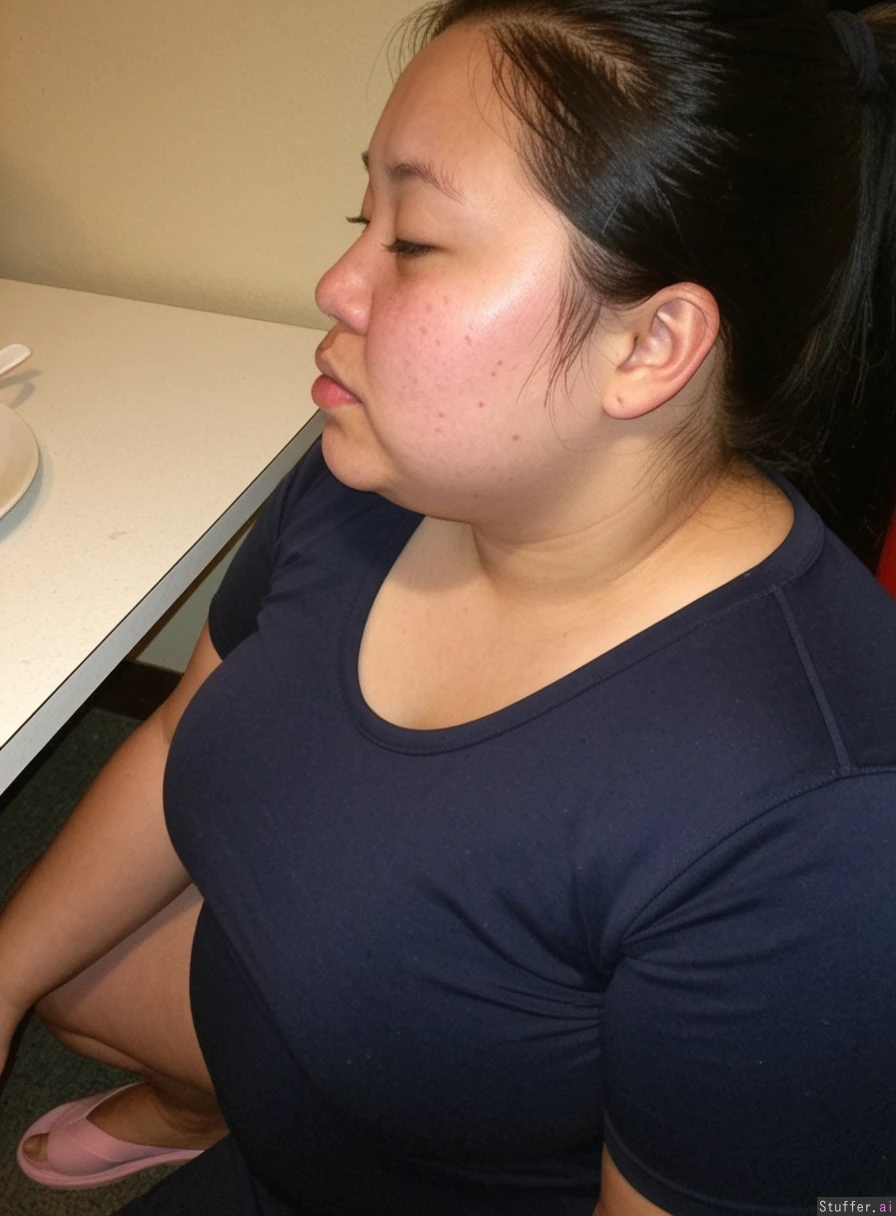 Chinese girl, morbidly fat , dark, swollen face, soft_jawline, 23 y/o, long_dark black_straight greasy hair) (((fully_dressed))) ((Fat double-chin, no neck)) ((No makeup, greasy face)) She doesnt wear makeup. She has some acne and puffy cheeks. Side profile. High angle shot wearing tight yoga pants and strained t shirt with tight sleeves.. Shes fat and her belly is hanging. Wearing slippers. Fat calves and cankles Shes waddling through her favorite Chinese restaurant. Big (fat_belly), (((fatty face))) (Flabby arms) Junk gross , she is sweaty