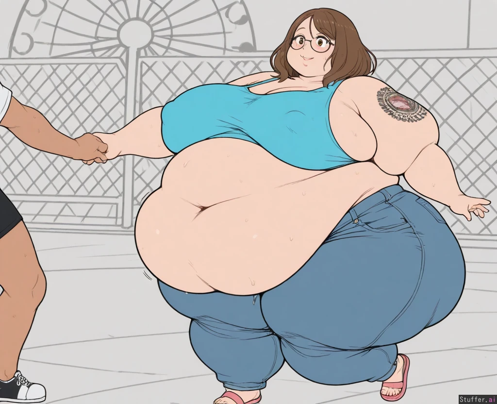 score_9_up, score_8_up, score_7_up, 1 USSBBW girls, ((simple art style)), (((line color art))), , sexy, tan skin, brown eyes, plump pink lips, eyelashes, (cellulite) , at theme park, 32 year old bottom-heavy nerd, ((morbidly obese)),, large plump breasts, nipple piercing, short wavy voluminous brown hair, blue top, denim jeans, ((fat face, triple chin)), ((double chin)), large belly, (fat arms), ((sagging belly)), ((round face)), long nails, ((deep navel)), side belly, massive titties, side boob, breasts bursting, (3/4 view), ((hardcore feederism))((800lbs:1.6, massive chunky overfed MILF)), extreme lymphedema ((Hungry but aroused))((arm tattoos full sleeve))((fattest stomach, big SSBBW belly, belly hanging to her knees))((oversized bottom-heavy body))((stuffing session, walking at theme park, struggling to move, sweating, cursed to gain weight, in love with her body))((full face))((euphoric and happy)) bellyheavy, hyper hips, wide hips, fat legs, hyper thighs, wide thighs, plump thighs, plump ass, hyper ass, plump legs and feet, holding her belly with one hand, ((1man, holding her boyfriends hand, African American male))