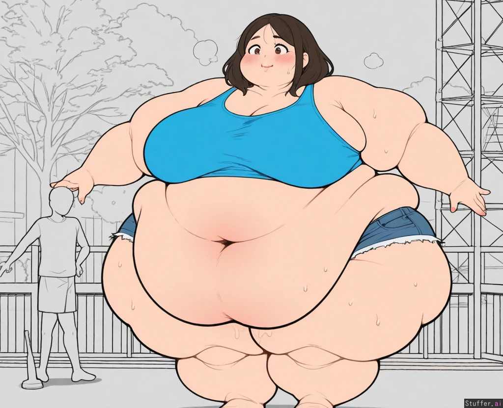 score_9_up, score_8_up, score_7_up, 1 USSBBW girls, ((simple art style)), (((line color art))), belly sagging, sexy, fair skin, brown eyes, plump pink lips, eyelashes, (cellulite) , at theme park, 32 year old bottom-heavy nerd, ((morbidly obese)),, meduim plump breasts, short very curly brown dark hair side part no bangs, too small blue top, denim shorts unzipped, ((fat face, triple chin)), ((double chin)), large belly, (fat arms), ((sagging belly)), ((round face)), pink nails, ((deep navel)), side belly, cute titties, side boob, breasts bursting, dimples, stretch marks, blushing, (3/4 view), ((hardcore feederism))((800lbs:1.6, massive chunky overfed MILF)), extreme lymphedema ((Hungry but aroused)),((fattest stomach, big SSBBW belly, belly hanging to her knees))((oversized bottom-heavy body))((stuffing session, walking at theme park, struggling to move, sweating, cursed to gain weight, in love with her body))((full face))((euphoric and happy)) bellyheavy, hyper hips, wide hips, fat legs, hyper thighs, wide thighs, plump thighs, plump ass, hyper ass, plump legs and feet, holding her belly with one hand, ((1man, holding her boyfriends hand))