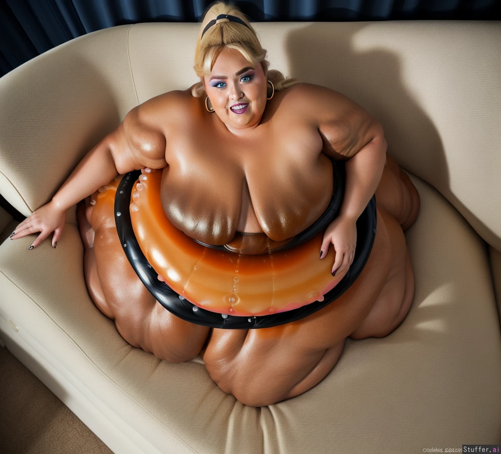 ssbbw (18K Ultra-HD) (rebel wilson:1.3) ponytail earrings (UHD, hyper-realistic:1.2) (high definition:1.2) blonde, ssbbw, (dark tanned skin:1.5), (full body:1.2) ((puffy squishy:1.5)) (rebel wilson) teeth ((makeup)) 1girl ((lying on back:1.0)) ((blue eyes;1.0)) sofa (((viewed from above:1.5)))