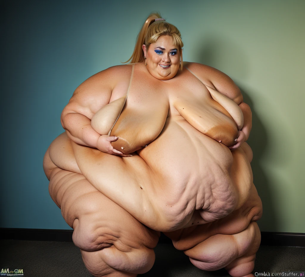 ssbbw (18K Ultra-HD) (rebel wilson:1.3) ponytail earrings (high definition) blonde, ssbbw, (dark tanned skin:1.5), (full body:1.2) ((puffy cellulite:1.2)) (rebel wilson) ((massive slumping belly:1.9)) nipples, (sagging under-belly;1.9) (blue eyes) teeth ((blue eyes, makeup)) 1girl (side view) (double chin:1.6) ((blue eyes;1.5)) (((hips are expanding wider:1.5))) ((mega-sagging breasts:1.6)) elf ((((gigantic arms:1.5)))