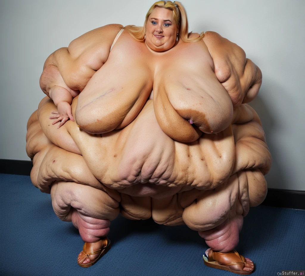 ssbbw (18K Ultra-HD) (rebel wilson:1.3) ponytail earrings (high definition) blonde, ssbbw, (dark tanned skin:1.5), (full body:1.2) ((puffy cellulite:1.2)) (rebel wilson) ((massive slumping belly:1.9)) nipples, (sagging under-belly;1.9) (blue eyes) teeth ((blue eyes, makeup)) 1girl (side view) (double chin:1.6) ((blue eyes;1.5)) (((expanding wider:1.5))) ((mega-sagging breasts:1.6)) ((((gigantic arms:1.9))) sandals toes (morbidly obese belly;1.5) (immobile belly:1.5)