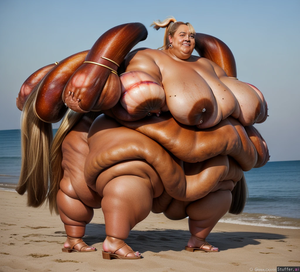 ssbbw (18K Ultra-HD) (rebel wilson:1.3) ponytail earrings (high definition) blonde, ssbbw, (dark tanned skin:1.5), (full body:1.2) (rebel wilson) teeth 1girl (side view) ((blue eyes;1.5)) ((((gigantic arms:1.9))) sandals toes ((mega-fat ass:1.2))