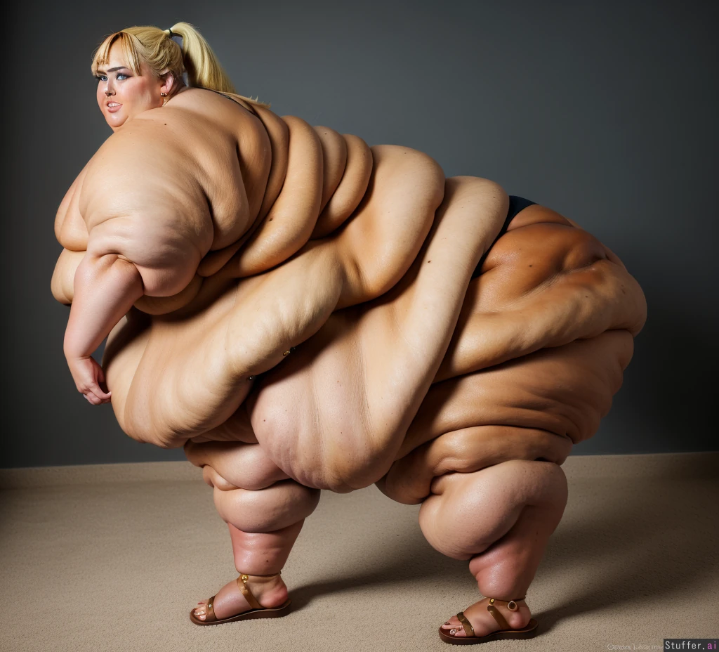 ssbbw (18K Ultra-HD) (rebel wilson:1.3) ponytail earrings (high definition) blonde, ssbbw, (dark tanned skin:1.5), (full body:1.2) (rebel wilson) teeth 1girl (side view) ((blue eyes;1.5)) ((((gigantic fat arms:1.5))) sandals toes ((mega-fat ass:1.2))