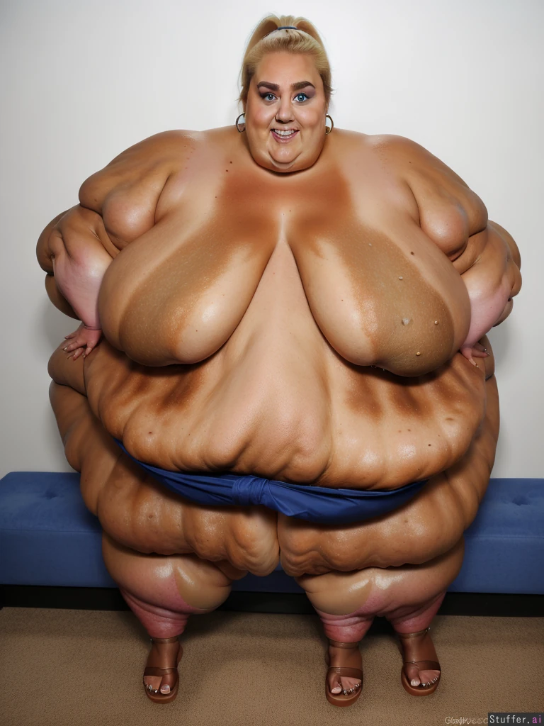 ssbbw (18K Ultra-HD) (rebel wilson:1.3) ponytail earrings (high definition) blonde, ssbbw, (dark tanned skin:1.5), (full body:1.2) (rebel wilson) teeth 1girl, supergirl, front view ((blue eyes;1.5)) ((((gigantic fat arms:1.7))) sandals toes ((mega-fat ass:1.2))