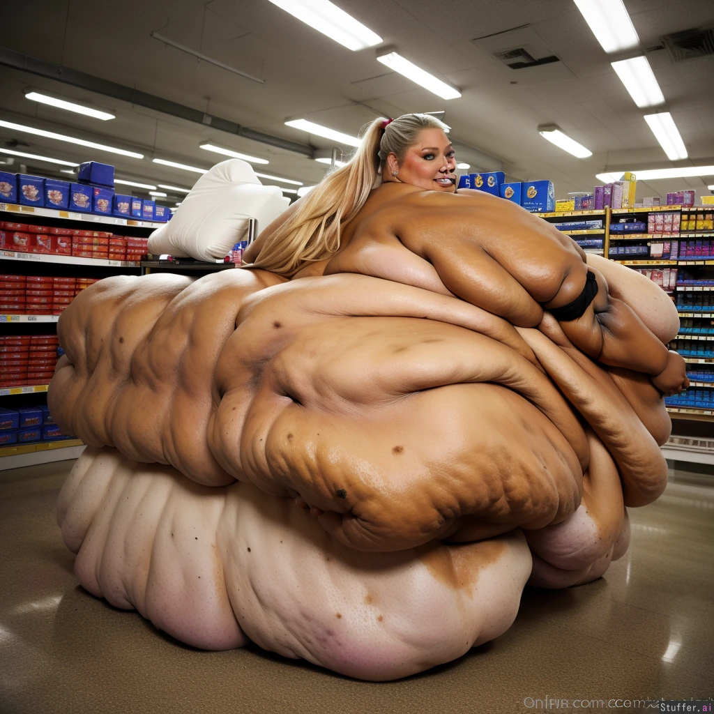 High quality, ssbbw, ((mega-enormous breasts:1.5)), long blond hair, (rebel wilson) (dark tanned skin:1.5) (extremely bottom heavy:1.7), (massive thighs:1.7), (sly smile), (naked breats:1.4), feminine, highly detailed face, (massive ass:1.7), belly stomach, shop aisle, massive belly ((((Hyper Extreme weight gain)))) ((((morbidly obese:1.5)))) ((((immobile:1.6)))) ((((Much fatter:1.4)))) ((blue eyes;1.5)) ((red rosy cheeks)) ponytail ((on back)) pluto