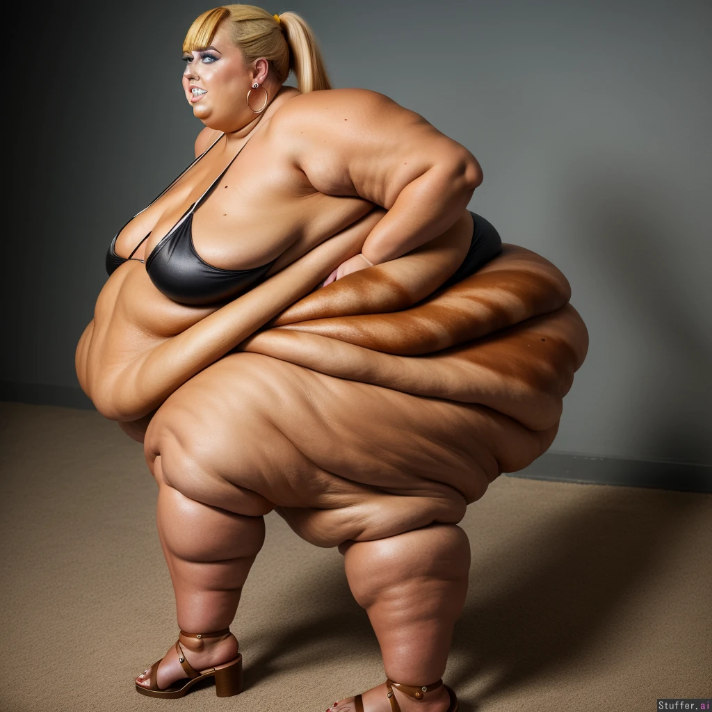 ssbbw (18K Ultra-HD) (rebel wilson:1.3) ponytail earrings (high definition) blonde, ssbbw, (dark tanned skin:1.5), (full body:1.2) (rebel wilson) teeth 1girl (side view) ((blue eyes;1.5)) ((((gigantic arms:1.9))) sandals toes