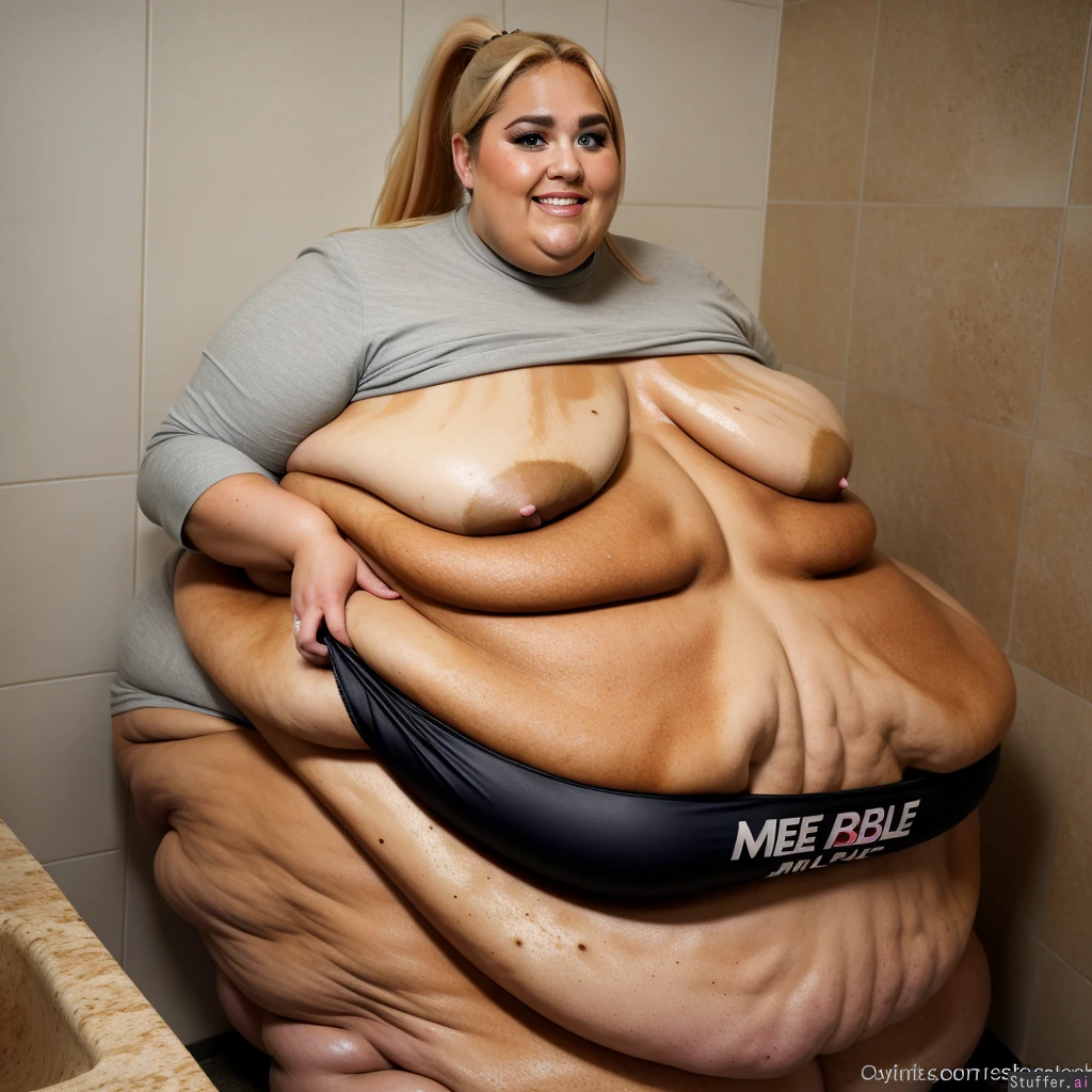 High quality, ssbbw, ((mega-enormous breasts:1.2)), long blond hair, (rebel wilson) (dark tanned skin:1.5) (extremely bottom heavy:1.2), (massive thighs:1.2), (sly smile), (long sagging breasts:1.4), feminine, highly detailed face, (massive ass:1.2), belly stomach, showering, massive belly ((((Hyper Extreme weight gain)))) ((((morbidly obese:1.2)))) ((((immobile:1.2)))) ((((Much fatter:1.2)))) ((blue eyes;1.2)) ((red rosy cheeks)) ponytail ((on back)) pluto
