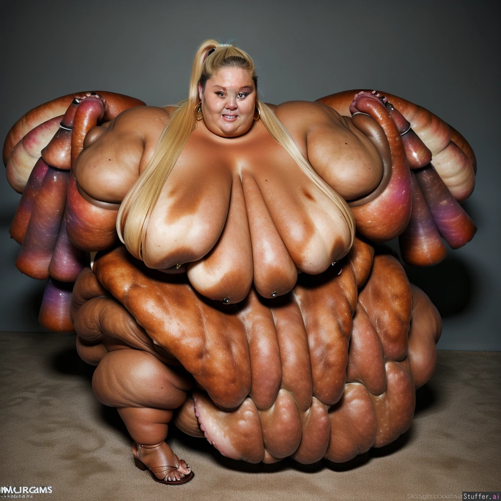 ssbbw (18K Ultra-HD) (rebel wilson:1.3) ponytail earrings (high definition) blonde, ssbbw, (dark tanned skin:1.5), (full body:1.2) (rebel wilson) teeth 1girl (side view) ((blue eyes;1.5)) ((((gigantic arms:1.9))) sandals toes ((((morbidly obese:1.2)))) ((((immobile:1.2))))