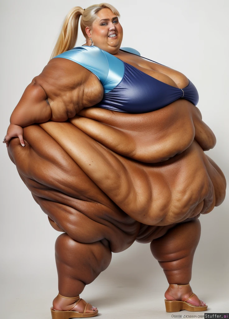 ssbbw (18K Ultra-HD) (rebel wilson:1.3) ponytail earrings (high definition) blonde, ssbbw, (dark tanned skin:1.5), (full body:1.2) (rebel wilson) teeth 1girl (side view) ((blue eyes;1.5)) ((((gigantic arms:1.4))) sandals toes ((((morbidly obese:1.2)))) ((((mega-immobile:1.2)))) ((sagging stomach:1.3)) ((side view:1.4))