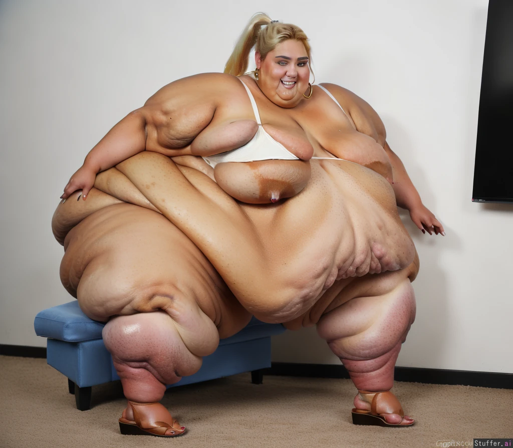 ssbbw (18K Ultra-HD) (rebel wilson:1.3) ponytail earrings (high definition) blonde, ssbbw, (dark tanned skin:1.5), (full body:1.2) (rebel wilson) teeth 1girl (side view) ((blue eyes;1.5)) ((((gigantic arms:1.4))) sandals toes ((((morbidly obese:1.4)))) ((((mega-immobile:1.4)))) ((sagging stomach:1.4)) ((side view:1.4)) office (((long sagging belly:1.6))) (white tights) (white bra) (((super-gigantic breasts:1.9)))