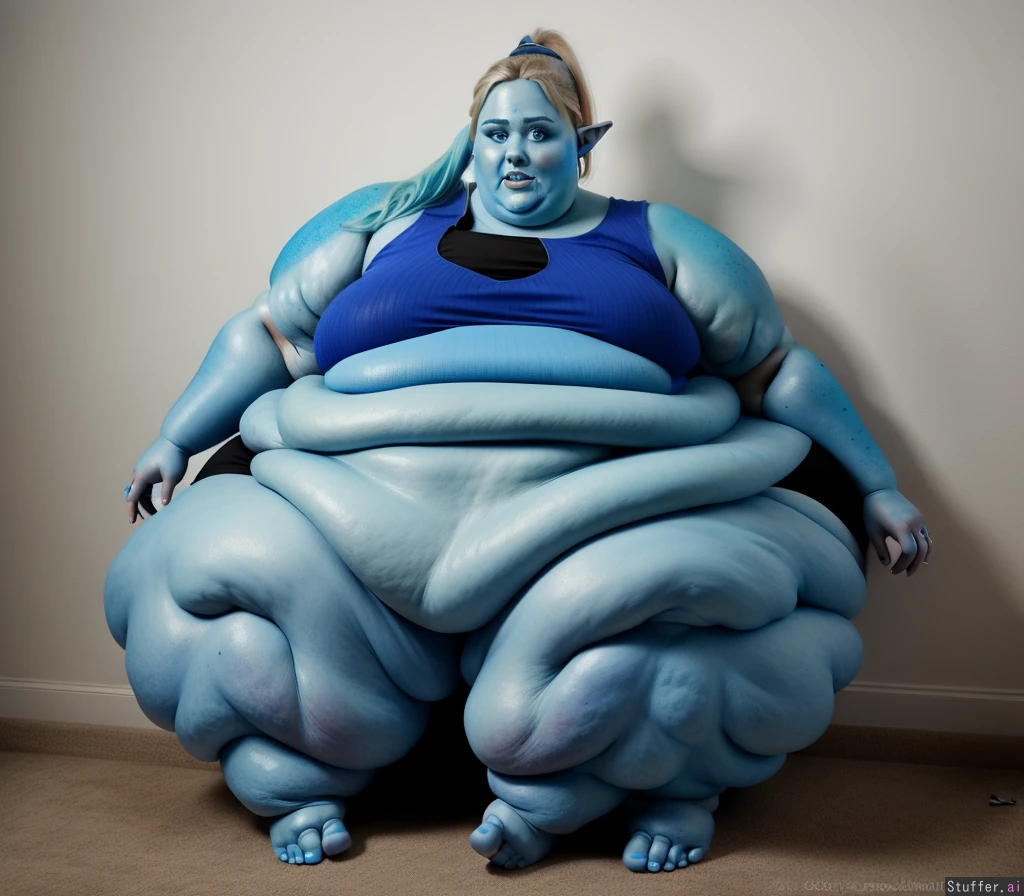 (rebel wilson) ((((morbidly obese:1.2)))) ((((immobile:1.2)))) ((blue colored skin:1.5)) feet elf ponytail