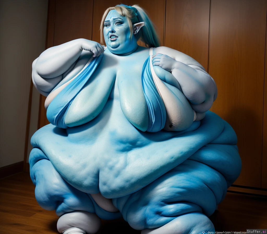 (rebel wilson) ((((morbidly obese:1.2)))) ((((immobile:1.2)))) ((blue colored skin:1.5)) feet elf ponytail (((super-gigantic, mega-enormous breasts, tits, boobs, under-boobs, side-boobs;2.0)))